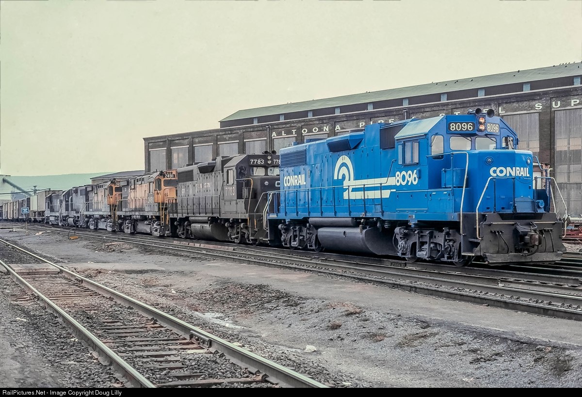 Six four axle units, from three builders and in three paint schemes, team up to take a manifest west from Altoona, Pennsylvania. During this period, while most trains were predominated by PC black EMD’s, one never knew what to expect as a headlight came into sight.