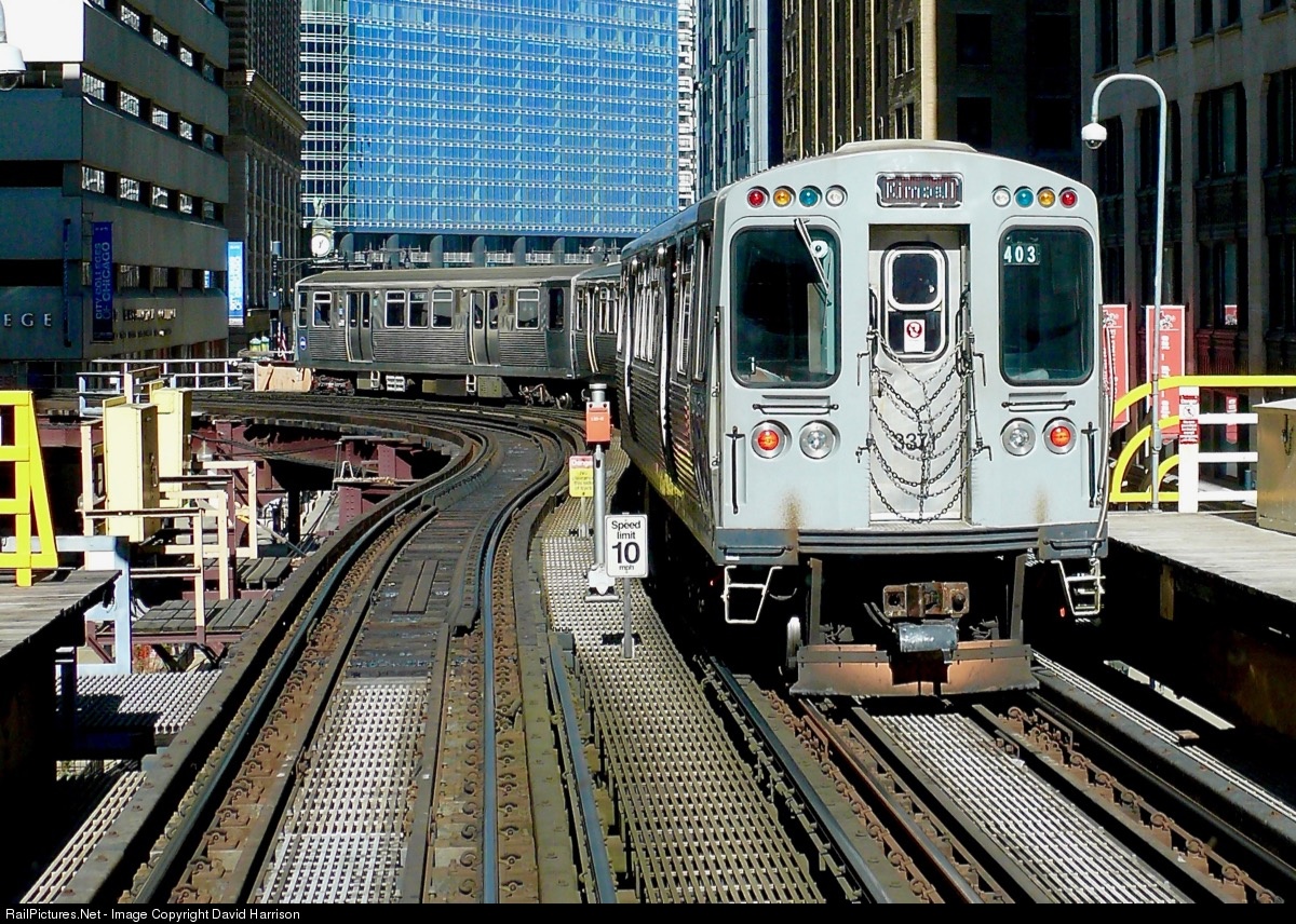 Opened in 1897, the Loop 'L' services five routes with three classes of equipment. A Brown line train of 3200 series cars slowly rounds the curve at Lake and Wabash.
