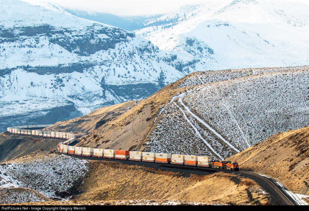 | The sun made an appearance for this South Seattle to Chicago Z9. The climb out of the Columbia River gorge will end at Quincy, WA. The train had two DP units on the rear so it was making pretty good progress on the 1% grade. |
