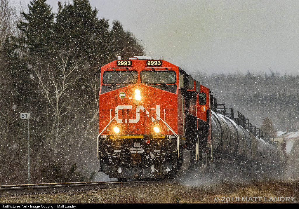 | During a small snowfall, CN 2993 leads westbound train 406, as they rumble through Passekeag, New Brunswick.