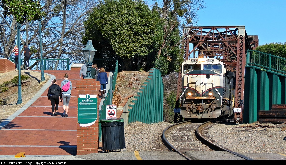 | Grinstein Green comes to Augusta: An image rarely seen in these parts came alive today as a crème n' green ex BNSF SD70MAC rolls into Georgia. This is one of 14 PRLX SD70MAC's that NS recently purchased and today it led from Columbia, SC to Augusta, GA on the NS 191. Here they are coming over the Savannah River and into downtown Augusta as they begin blowing for the street running section of downtown. A group of college students have come out to enjoy the weather and get some exercise at the Augusta River Walk as the train exits the trestle. |