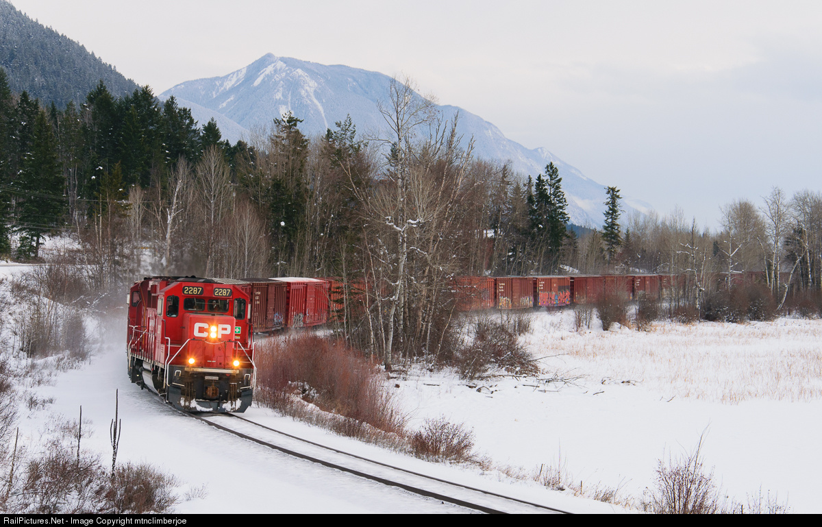 A Canadian Pacific GP leads the local towards Golden, BC through trackage running through the Rocky Mountain Trench, a massive valley filled with wetlands.