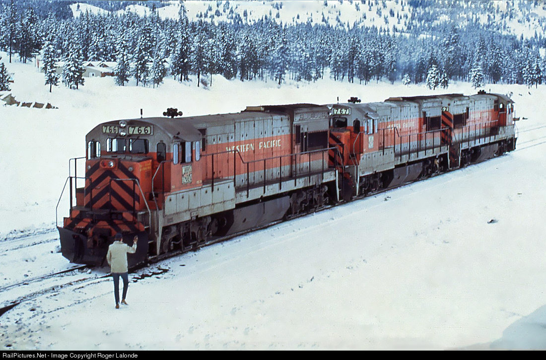 | Western Pacific GE U30B's 766, 767, 762 at Portola, California. No photographer listed on slide. |