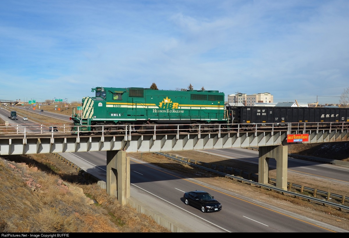 | OmniTRAX's 4201 (ex Canadian National and Hudson Bay Railway CompanyGP40-2W) crosses the Great Western Railway bridge over Interstate 25 as it heads into Loveland, Colorado. |