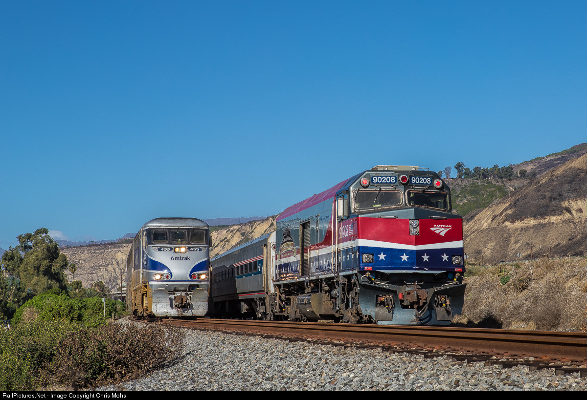 | Amtrak has added a new Surfliner, No.765 to help handle all the people trying to get to Santa Barbara and back due to the closure of hwy 101 and the mudslides at Montecito. NPCU in the Salute to Veterans attire, brings up the rear of the new train waiting at Seacliff for a late train No.774 from San luis Obispo. All Amtrak trains are having a tough time with schedules with the crush of passengers and slow orders. |