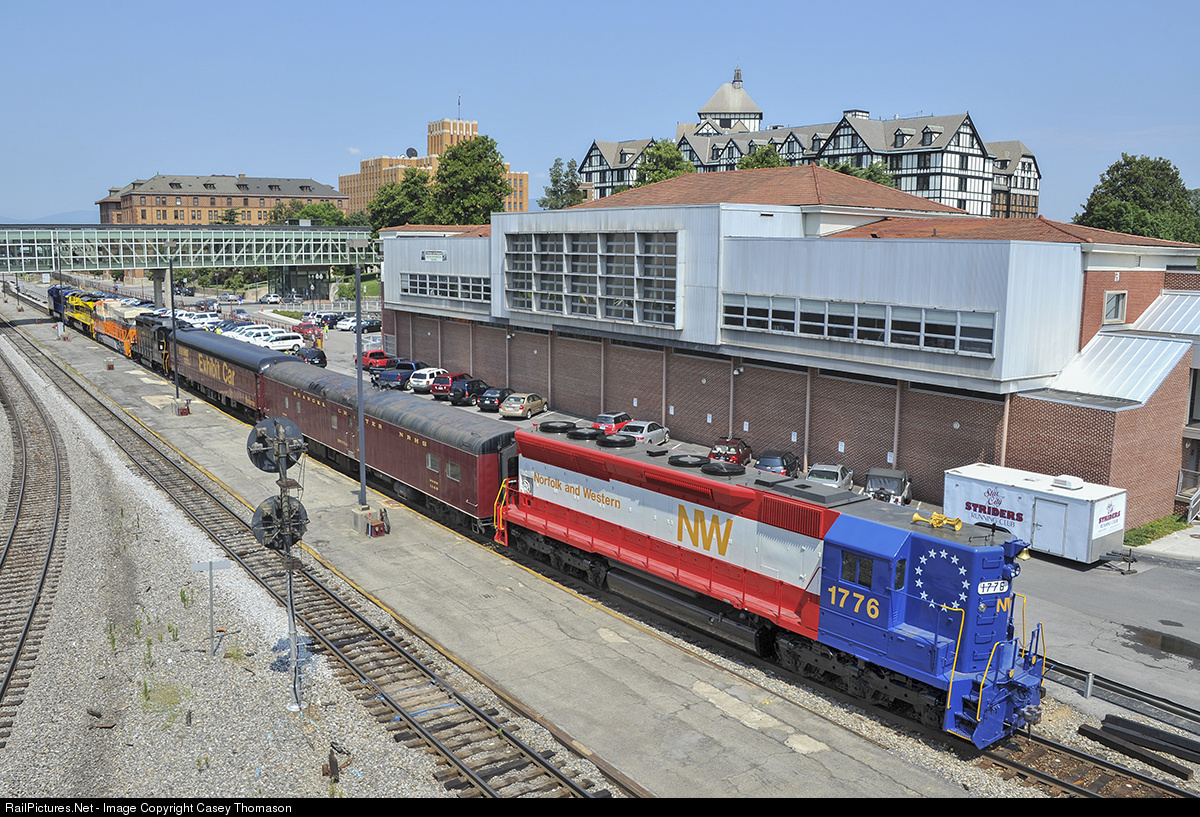 Norfolk & Western's bicentennial unit, SD45 #1776, eases by the old NW passenger station (now home to the O. Winston Link Museum) in downtown Roanoke, Virginia, while being shuffled around town from the NS yard to its current display location at the Virginia Museum of Transportation.