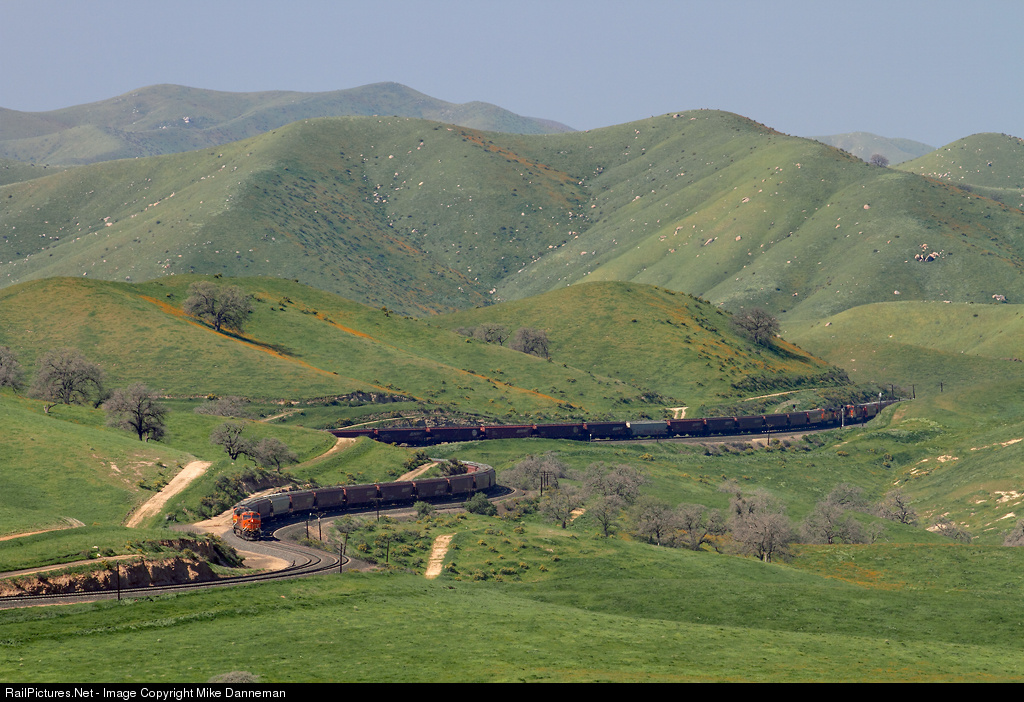 Dropping downgrade on serpentine trackage at West Bealville is a westbound BNSF unit grain train on February 25, 2016. The heavy train is negotiating California’s Tehachapi Pass route, with two DPU locomotives on the rear of the train, as well as a three-unit set in the middle of the train, seen at signals at West Bealville on the right.