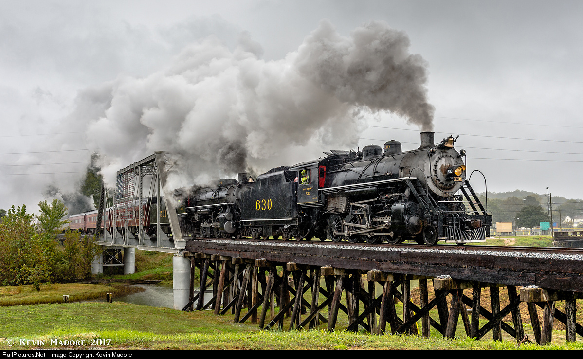 When the TVRM doubleheads on these trips, the helper (leading) is typically the 2-8-0 Consolidation #630, as she is the lighter of the two locomotives. Built in 1904, by the American Locomotive Works, the 630 is a heavy freight hog with over 46,000 lbs of tractive effort. The road engine is the big Mikado #4501. She's slightly newer and somewhat heavier than 630. The 4501 is a 1911 Baldwin Product with just under 54,000 lbs of tractive effort. Both locomotives have undergone restorations within the past 7 years, with 630 coming back on line in 2011, and the 4501 seeing her first service of the 21st century in late 2014.