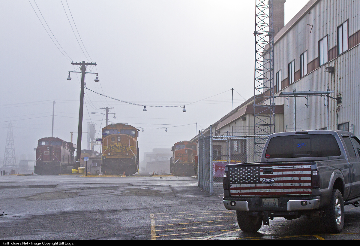 | BNSF 8860, an SD70MAC is surrounded by CP and BNSF GEs as it sits in the fog at Wenatchee. Used to flags displayed on many locos these days, a BNSF employee has taken that a step further by placing a flag on the tailgate of his Ford pickup. Mean time blue flags on the units protect employees doing service work them. |