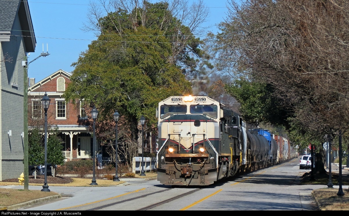 | Grinstein Green Through the Streets of Augusta: The classic SD70MAC is almost through the last portion of street running in downtown Augusta. They are slowing to a stop as a maintainer will climb on the engine to inspect something a little further ahead. Once complete, the train will continue the journey to Macon after a short stop and swap in the yard. |