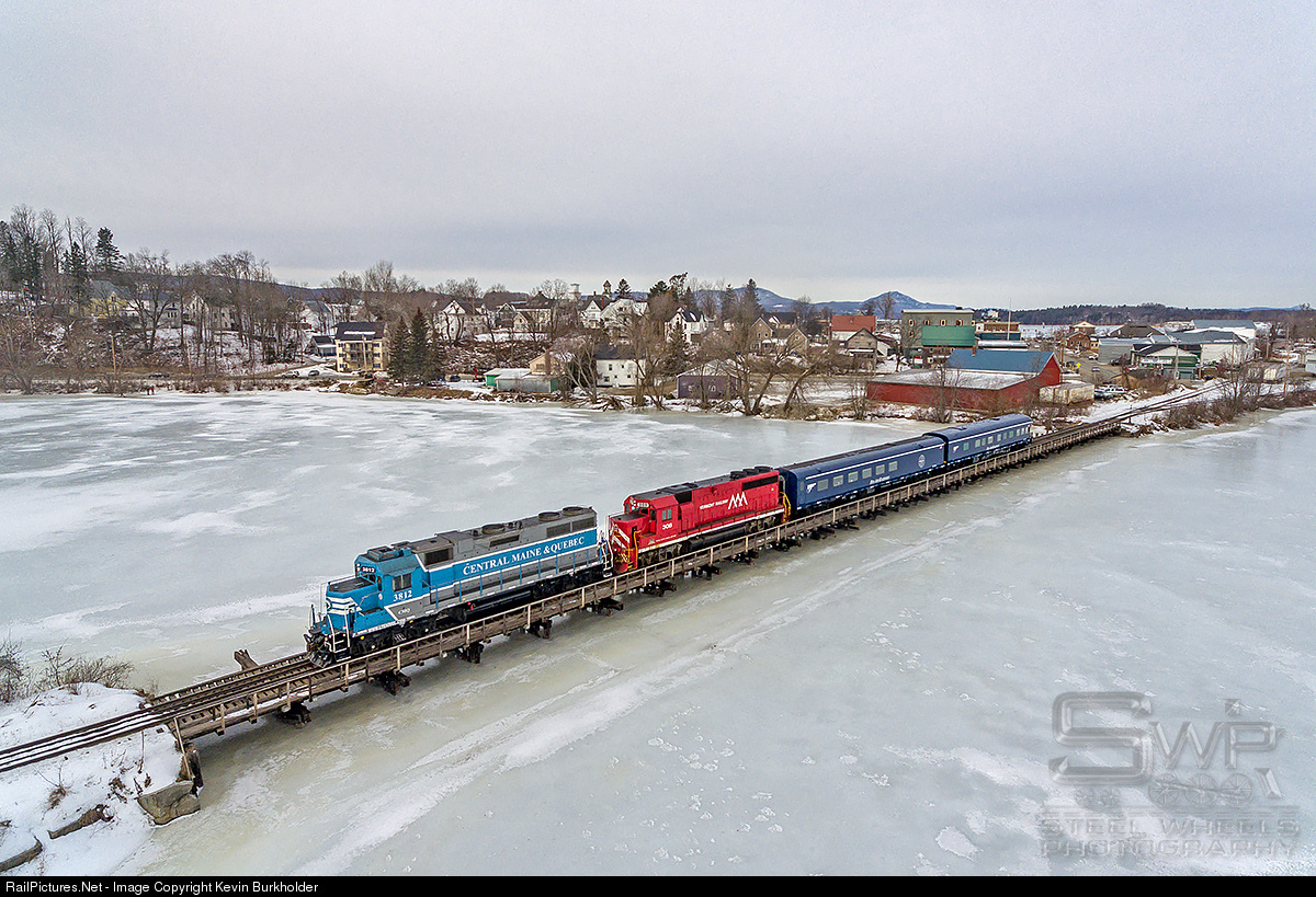 In one has to be one of the most colorful office car trips anywhere, Central Maine & Quebec, Vermont Rail System and Pan Am Railway equipment rounded out a trip from Farnham, Quebec, to White River Junction on January 30. The train has just begun the trek on the Vermont Rail System's Washington County affiliate Lyndonville Subdivision with CMQ GP38-3 3812, VTR GP40-2 308 and the Pan Am Railways office cars, ST 101 and 100.