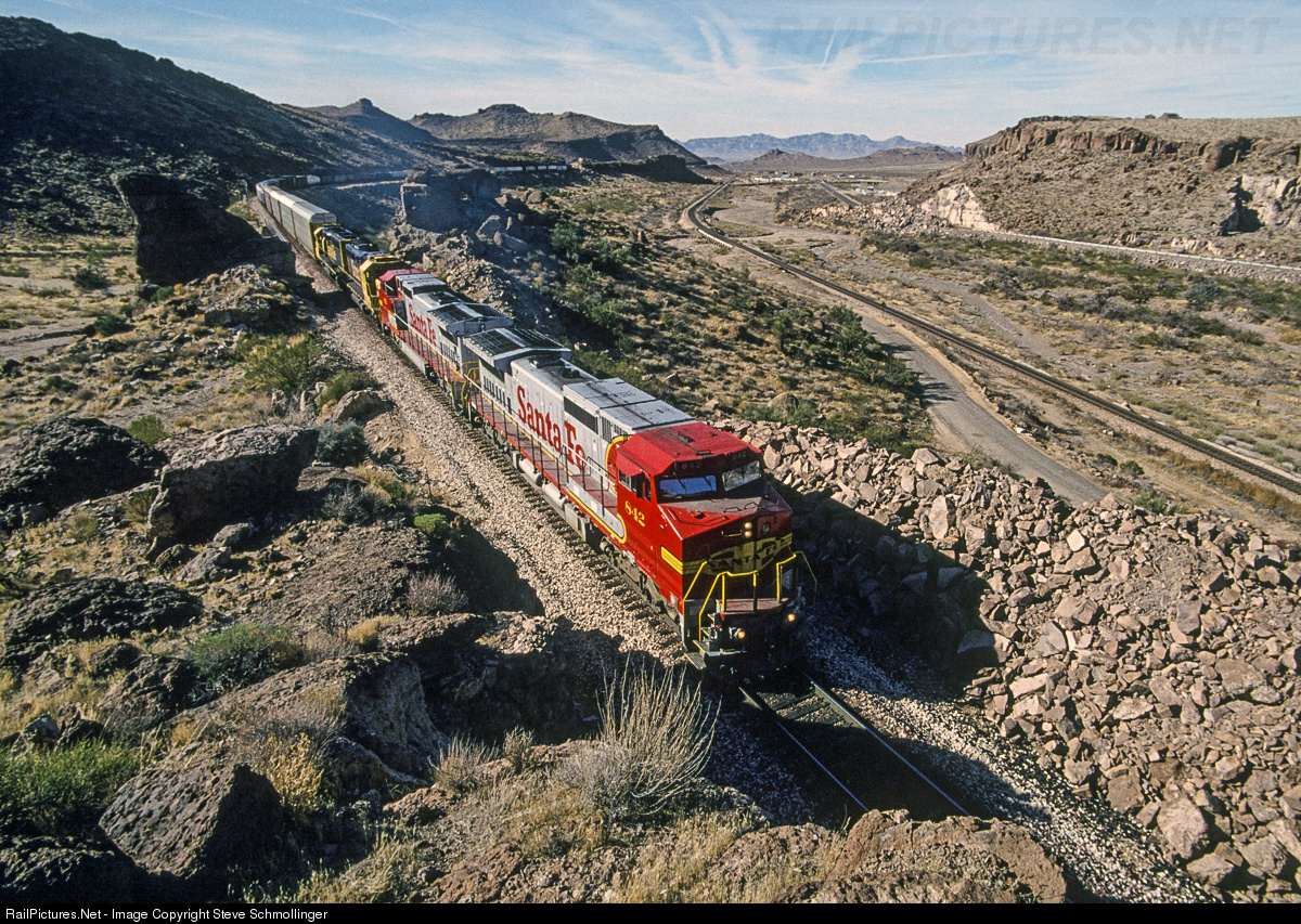 | Santa Fe 842 East roars uphill through Kingman Canyon on the upper track, which is normally the eastbound main line. At right is the westbound main that heads down the Sacramento Wash and around the Black Mountains to the Colorado River. |