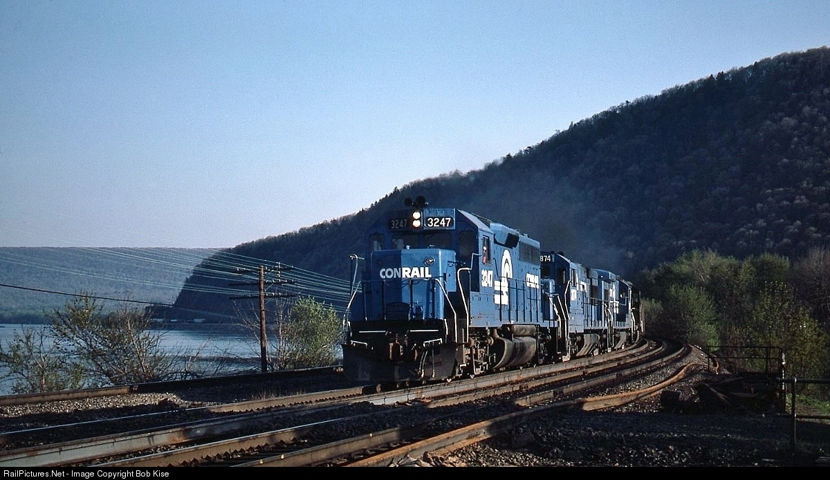| Apollo 8 was circling the Moon when GP40 No. 3247 was delivered to the Penn Central in December of 1968. Here it is 11 years later, in service with Conrail, westbound in the beautiful Susquehanna Valley. It was later sold by Conrail and renumbered as the Boston & Maine 330. |