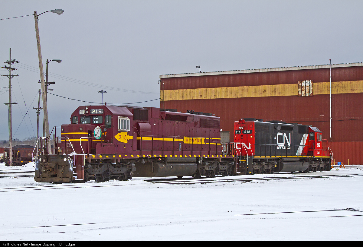 DMIR SD38-2s 215 and 212 are together at Proctor Diesel Shops, Proctor, MN. They are set up to handle switching duties. No. 215 is the last active SD38-2 in maroon paint.