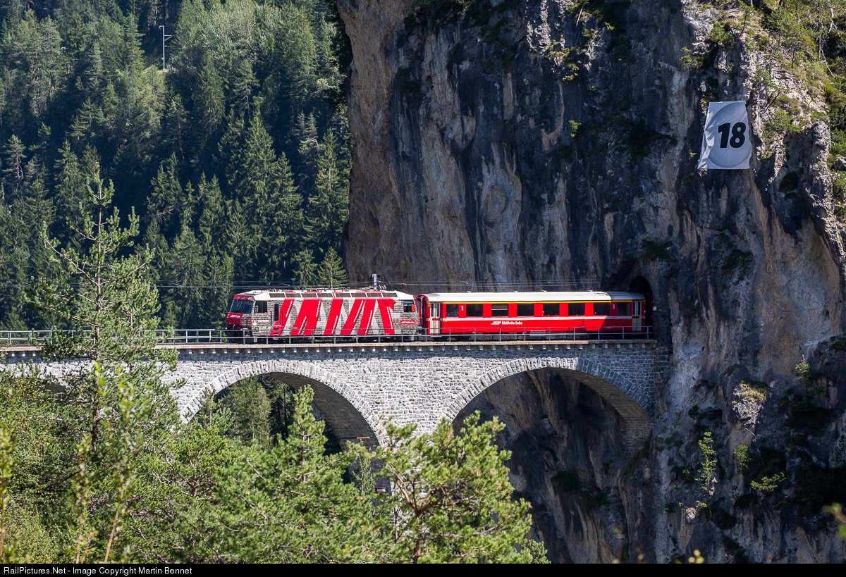 | A passenger train emerges from the cliff face onto the spectacular UNESCO listed Landwasser Viaduct. Locomotive No. 642 is in a special livery made up of images of RhB staff. The big '18' on the cliff is part of the 'RhB Lotto,' a competition for passengers. You can watch some video of this location here: https://youtu.be/gMHqd12RnVM |