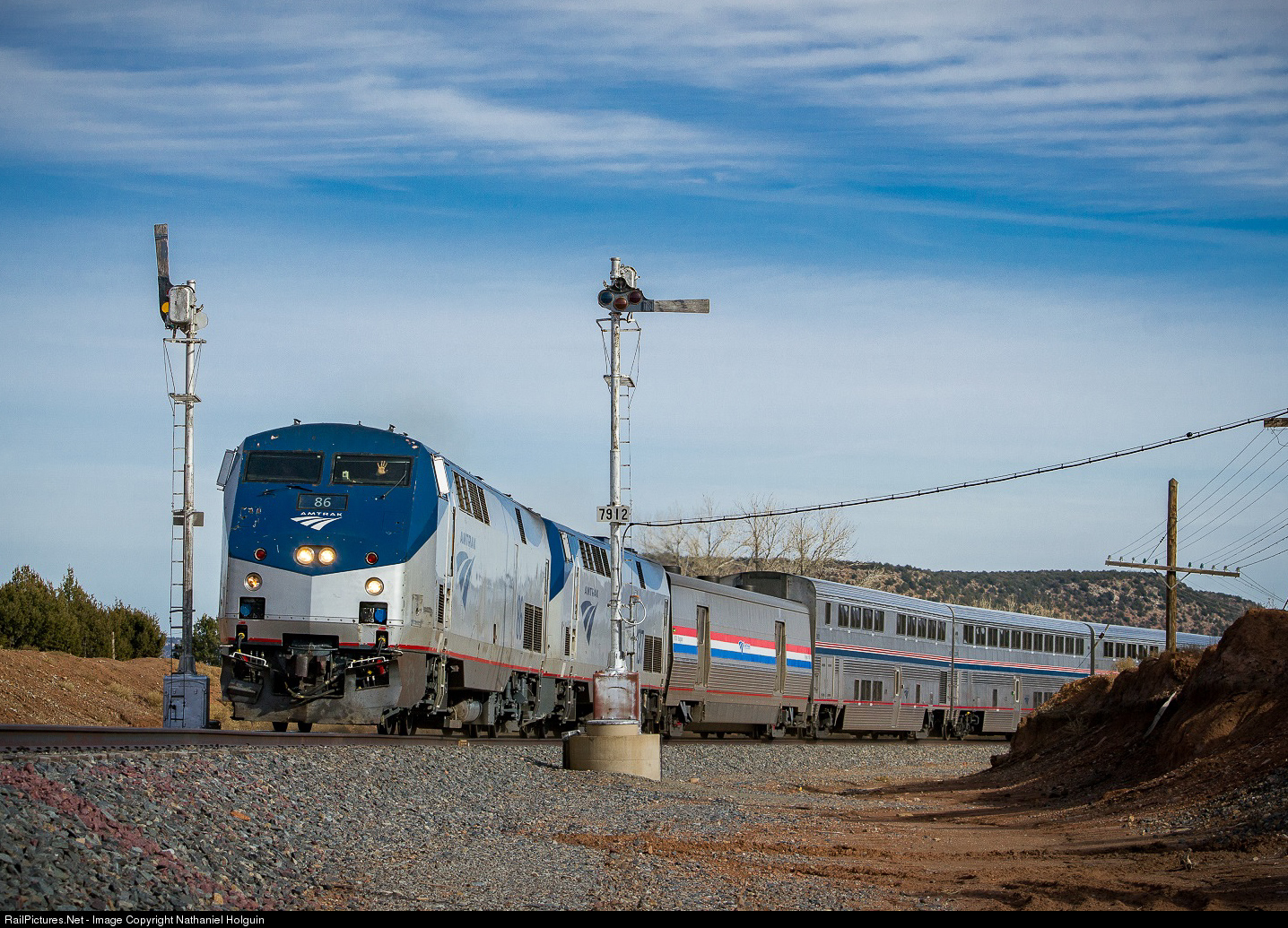 | A friendly wave from the engineers as the westbound Southwest Chief whips around the corner at the 791.2 intermediates, one of the more popular set of semaphores along the former Santa Fe transcon. |