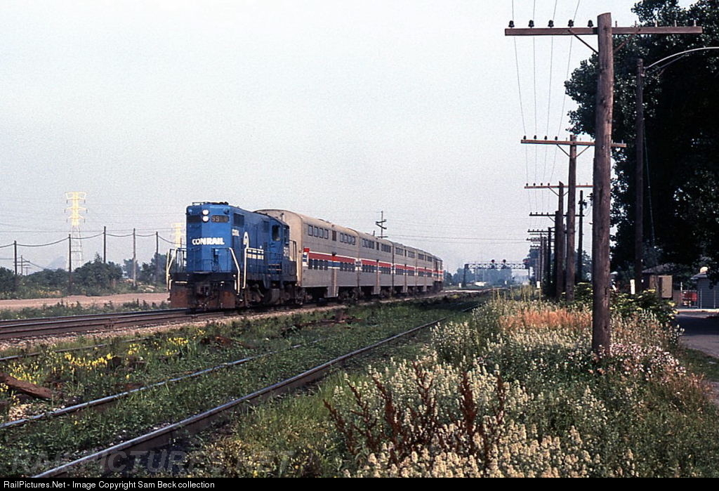 Dating back to the days of the Pennsylvania Railroad, commuter service was operated between Chicago and Valparaiso, Indiana, and lasted into the 1980s. In this instance, a Conrail GP7 is seen assisting the Amtrak bilevel consist that became commonplace for this service. Tom Golden photo.