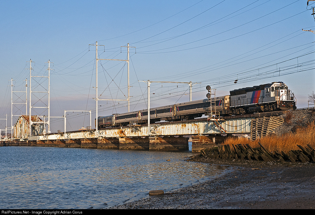 | The silence of the shores of Raritan Bay is interrupted as a westbound Hoboken to Bay Head express crosses the Raritan River Drawbridge at South Amboy, NJ. This train runs as an express from Newark to Woodbridge and skips Perth Amboy. From South Amboy, it will make all local stops to Bay Head. This bridge is expected to be replaced by a lift bridge in the near future. |
