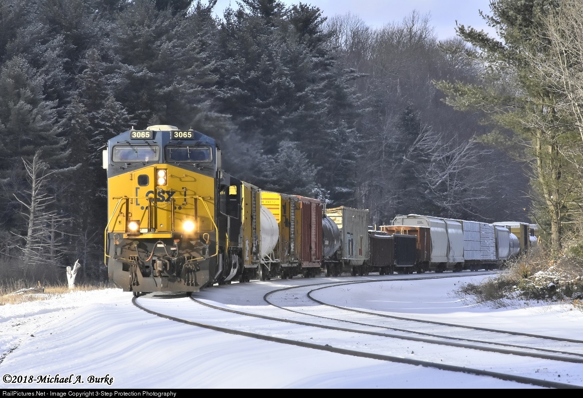 | CSX ES44AC-H 3065 makes easy work of the small Q424-08 from Selkirk yard, as the train crests the top of Washington Hill on a chilly Thursday afternoon in the Berkshires. |
