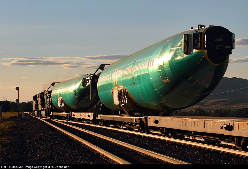 Glinting fuselages Two Boeing 737 fuselages follow the power of a westbound BNSF train back on to the main line at West Winston, Montana, at sunset on June 29, 2017. These fuselages are built by Spirit AeroSystems, and are being shipped from Wichita, Kansas, to Boeing in Renton, Washington, for final assembly. They are shipped on specially-modified BNSF 89-foot flatcars and besides being a wide load, the length of the fuselage is over 100 feet, so idler flatcars are also used for each one, under the tail section. The “green” color of these fuselages is a thin protective coating applied at the factory to prevent the aluminum skin from oxidizing during shipment, and is removed before the airplane is painted.