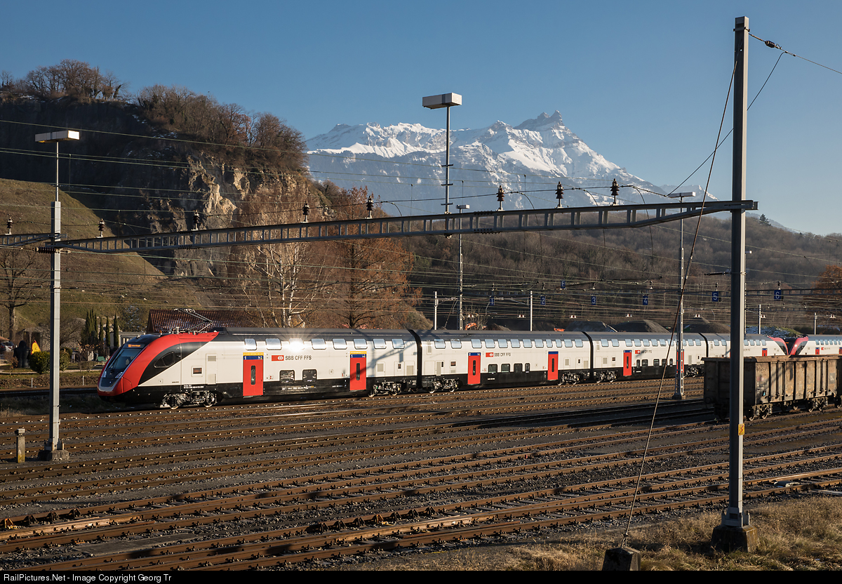 Coupled doubledeck intercity trains "Twindexx Swiss Express" from Bombardier for the SBB, during tests in the St-Triphon freight yard. On the left 100 meter long RABe 502 # 402, on the right 200 meter long RABe 502 # 207, both of the Interregio type. A total of 62 trainsets in three different configurations should be delivered to the SBB, but are years behind schedule. In the background is 2969 meter high Dent de Morcles.