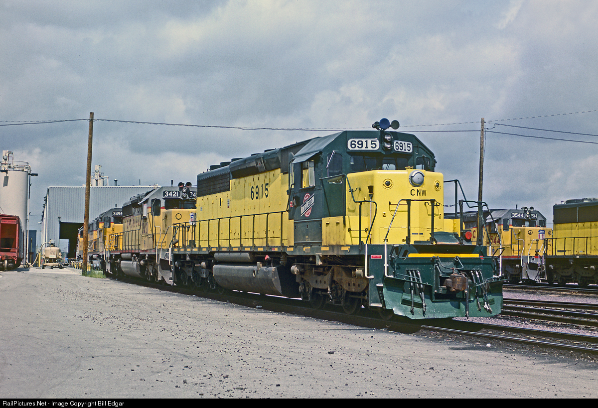 | CNW SD40-2 no. 6915 almost looks out of place in its own yard with all the UP power hanging around. Four years before the merger, it looks like UP already owns the operation. This unit features a fresh version of the Zito scheme, but soon units would revert back to the traditional yellow before UP would take over in 1995. |
