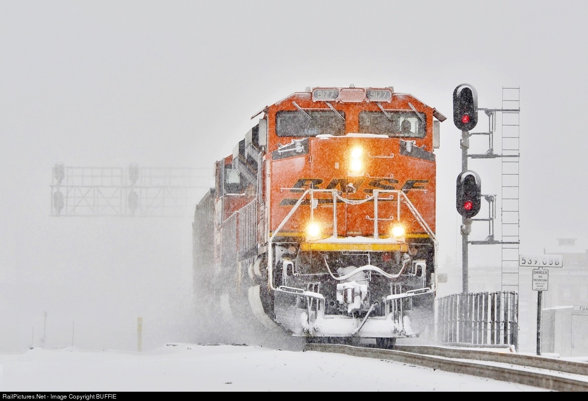 The snow is flying as BNSF 9177 (SD70ACe) runs past a signal on the Brush Sub.