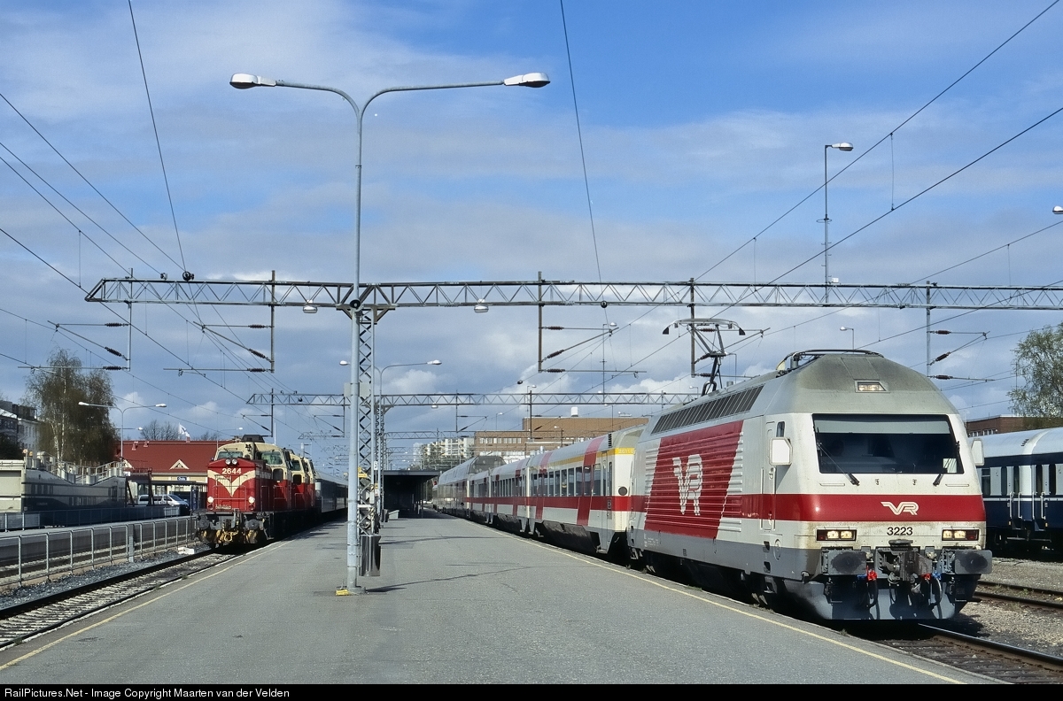 | At Oulo station on the right VR Sr2 3223 with IC 56 from Oulu to Helsinki and on the left VR Dv12 2644, Dv12 2503 and Dv12 2632 with P 976 from Rovaniemi to Kuopio.