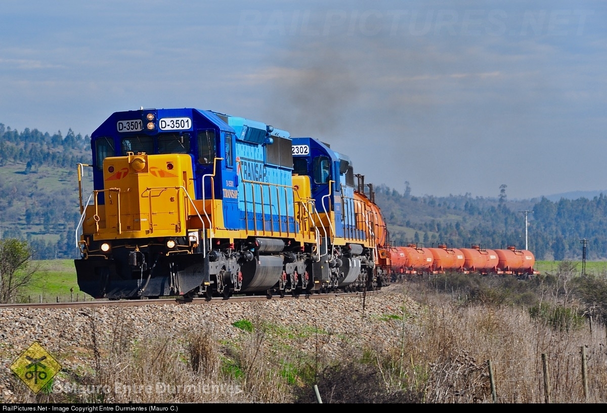 | Freight train of TRANSAP railway with EMD rebuilt SD50 No. D-3501 leading the train, former Union Pacific EMD GP50, route Barrancas (San Antonio) - Los Lirios (near Rancagua city), loaded with sulfuric acid for export to great copper mines of northern Chile. Second locomotive EMD rebuilt SD39-3M. |