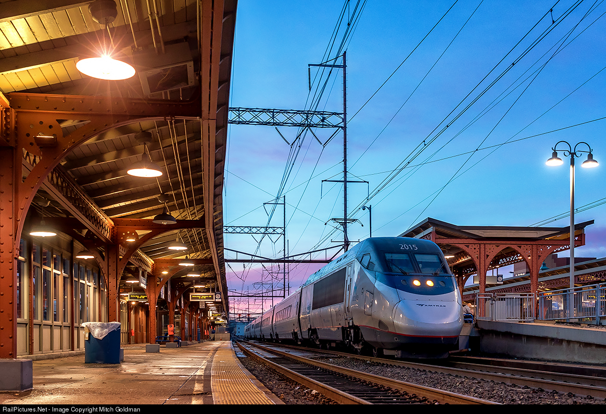 A north bound Acela Express makes a late evening station stop at the renovated Wilmington Train Station, also known as the Joseph R. Biden, Jr., Railroad Station.