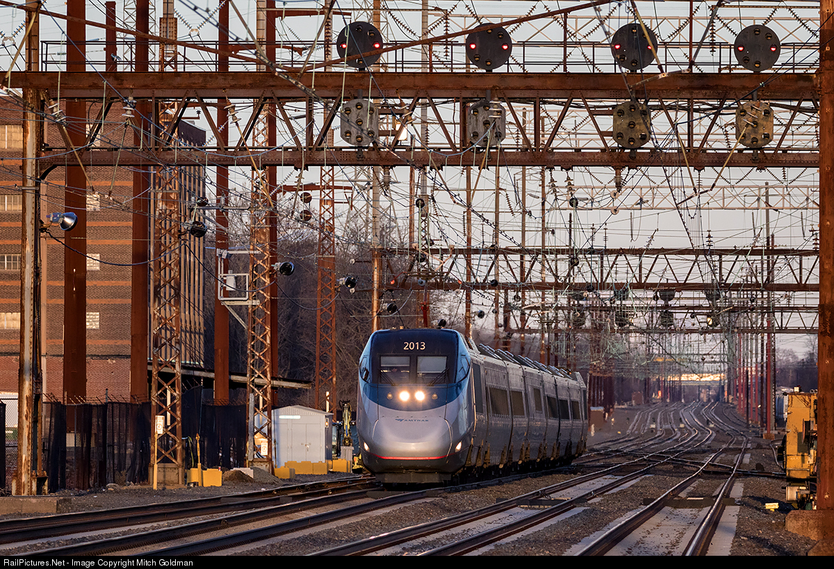 | An Acela Express ducks the signal bridge at Marcus Hook, PA as it barrels south down the NEC bound for Wilmington, DE. |