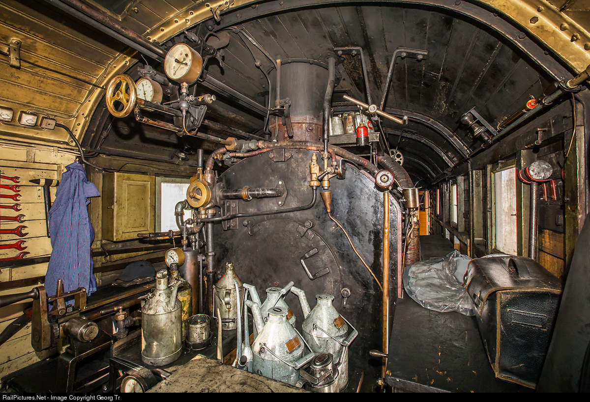 In the cab of the rotary steam blower Xrot d # 9213 from 1910, which is a sort of "cab forward" (compare with picture ID 648763). View backwards to the boiler, with smokebox door and chimney above. On the left the reverse gear for the snow impeller of 2,5 meter diameter. On both sides of the boiler, it is possible to reach the firemans place at the end of the vehicle, but this is only possible in a strongly bent position or creeping, because below of this longitudinal aisle is the steam engine for the snow impeller. The space of the fireman is normally reached via a side door. The oil cans in the foreground still bear the designation "R 1051", the designation when the machine was delivered in 1910.