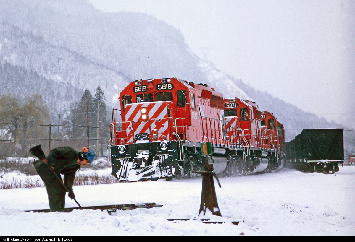 | A CP worker does the time honored work of cleaning out a switch with the traditional railroad broom/chisel at North Bend, BC after a weekend blizzard. CP 5819 is ready to roll west down the Fraser Canyon to Coquitlam and will soon leave town. |
