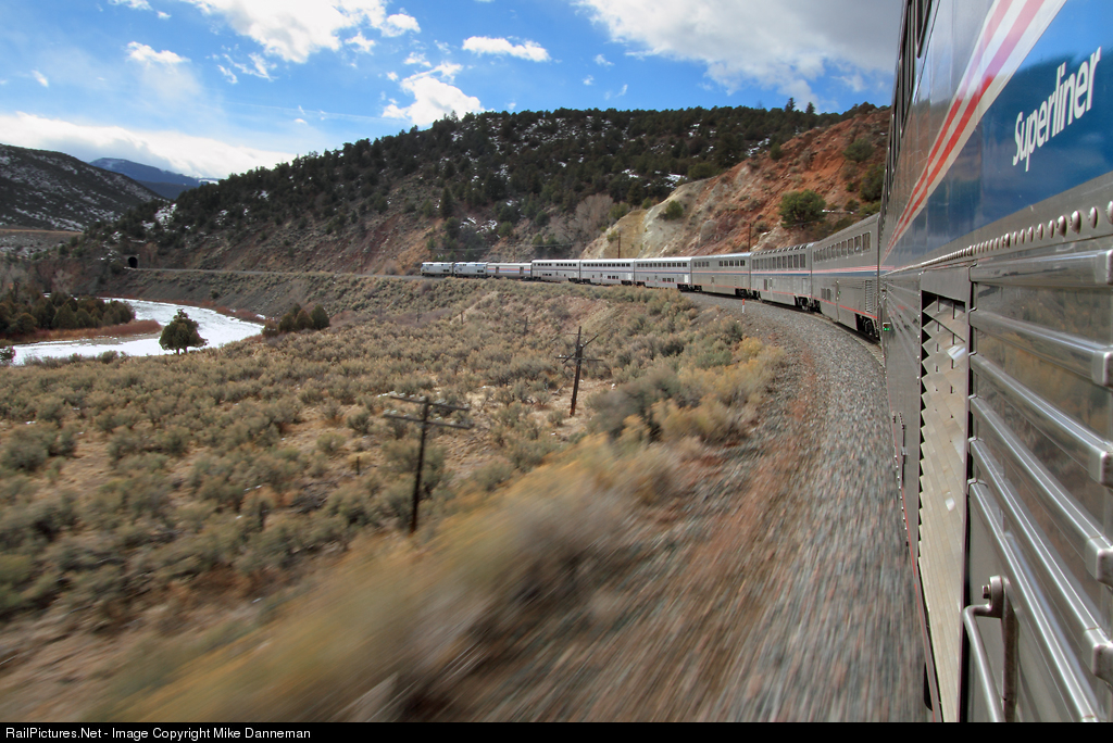Amtrak’s California Zephyr approaches Tunnel 42 along the Colorado River just east of Radium, Colorado, on its trip west on the former Rio Grande route through the Rockies. The view is from an open vestibule dutch door on a one of the private cars trailing the standard Superliner consist of No. 5 on February 5, 2018.