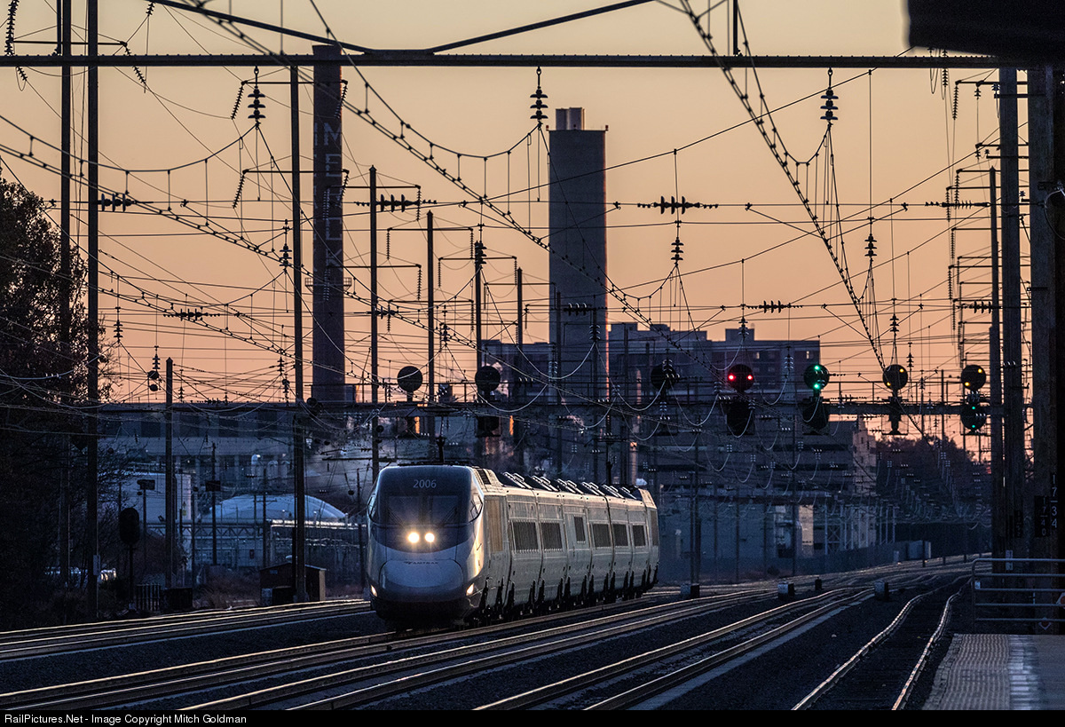 A late evening Acela Express, led by No. 2006, charges north through Linden, NJ, passing the iconic stacks of the Merck & Company pharmaceutical plant.