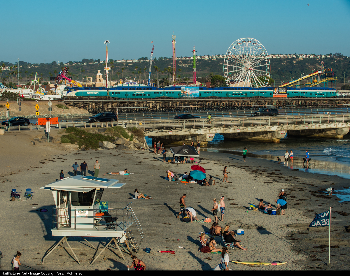 661 to Oceanside glides through Del Mar passing the annual San Diego Fair as many enjoy the holiday weekend on Del Mar's North Beach, a well known dog friendly beach.