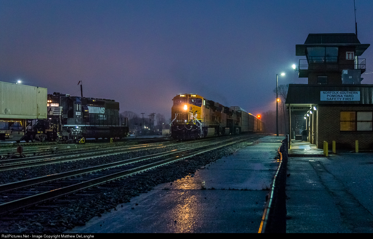 NS 212 pulls past the Pomona yard tower and an old NW Veteran SD40-2 high hood shoving 212s pick-up to the north end of the yard.