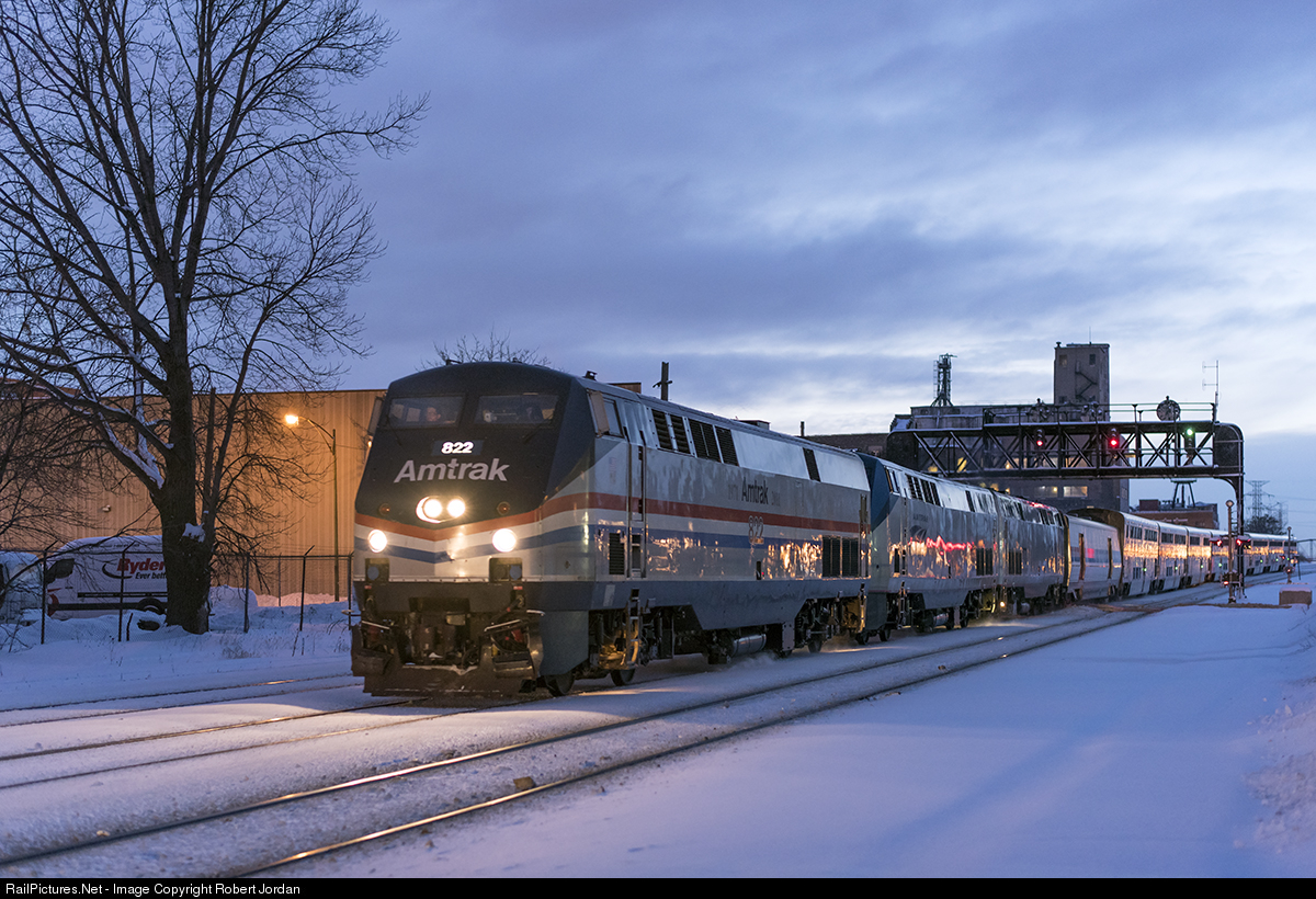 The Empire Builder approaches Chicago Union station in the depths of the Blue Hour. The lights of an outbound Metra train are reflected on the cab and side. The plant in the background is ADM milling, originally Eckart andSwan from the 1890's. It is one of the last industrial rail customers in the area.