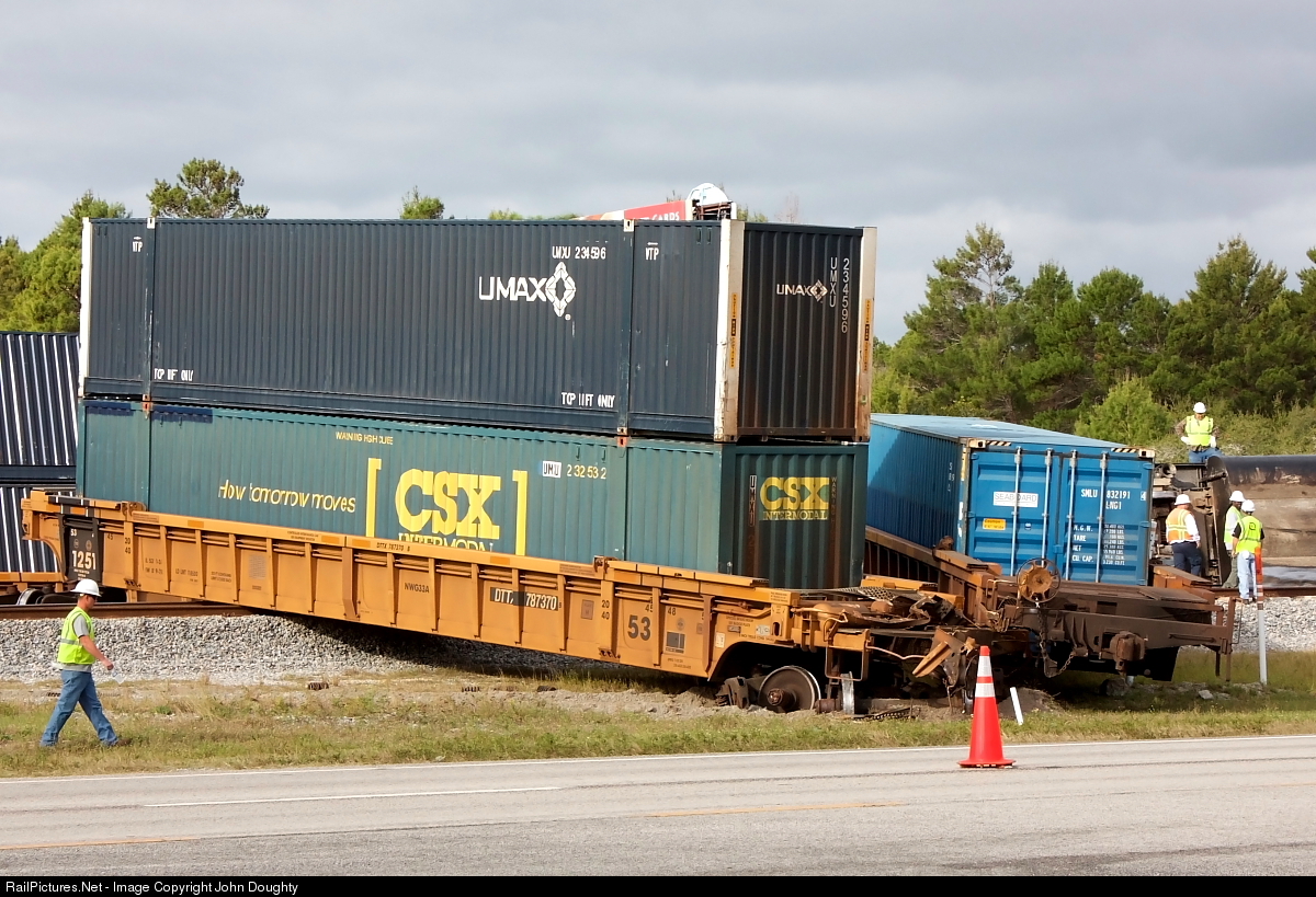 It is going to be a long day as FEC crews look over the damage after FEC train 226 north derailed coming out of the north end of the Pineda siding. FEC 433 is on its side, while FEC 413 remained on the rails. 5 double stack well cars derailed but remained upright.