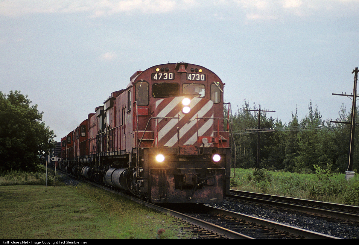 Normally most of the westbound MLW action was in the morning and, after the weather closed in, my Dad and I had finished for the day and gone to dinner at St. Huberts. We kept the scanner on just in case, and heard the dispatcher calling to "Extra 4730 West" just as the weather began to clear at sunset. This train traveled at restricted speed due to a crane in the consist, enabling this shot at last light at a shutter speed of a 60th of a second.