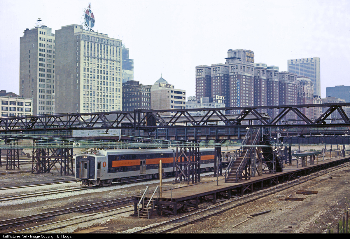| An Illinois Central Highliner commuter train leaves a station just south of the Conrad Hilton hotel in Chicago and heads south to the suburbs. The Chicago, South Shore & South Bend also used (and uses) trackage here. |
