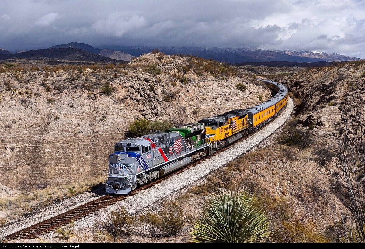 “Out of the darkness into the light” UP 1943 leading a westbound passenger special across UP’s Lordsburg Subdivision aka “The Stormy.”