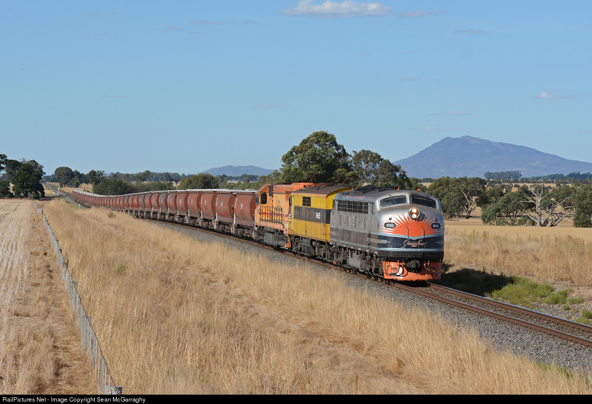 | B61, GM22 & L277 combine to work SSR's 7934 loaded grain ex Dimboola through Maroona where the mountain ranges make a nice backdrop for the train as it makes its way back to Melbourne. |