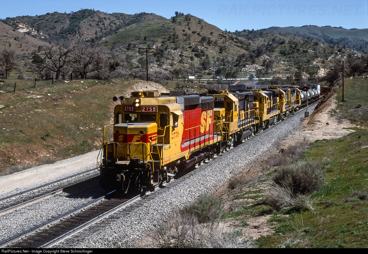 On a warm afternoon in the spring of 1988, a Santa Fe westbound with four-axle locomotives for power heads downhill at Woodford. Rebuilt GP30u (for "upgrade") No. 2759 is in the lead wearing the red, yellow, and black of the failed SP-Santa Fe merger. This train appears to have originated at Barstow.