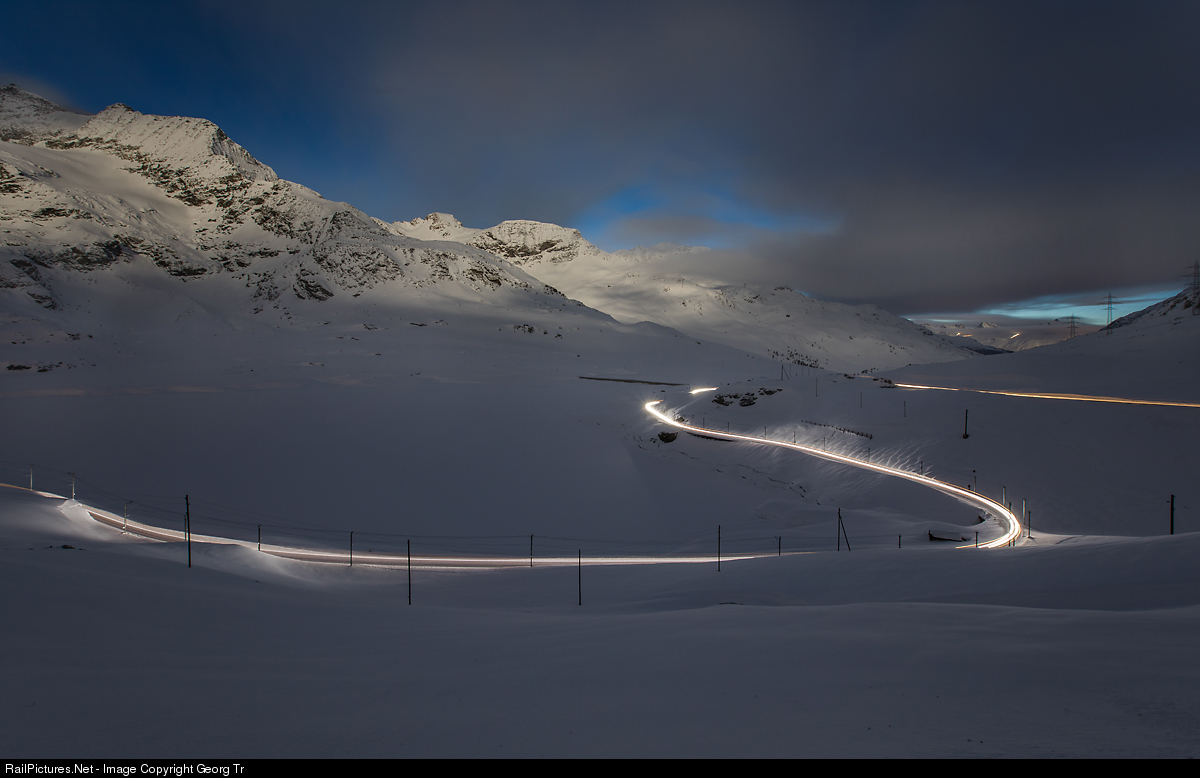 It is 7.05 PM and minus 8 Celsius (17,6 F) , the full moon has risen and illuminates the mountains in the background, the Piz Arlas (left), the Munt Pers and the Diavolezza area. Along the banks of the frozen and snow covered Lake Bianco, around the bay of the Bügliet valley, the "Full moon special" of the Rhaetian Railway run at an altitude of 2250 metres above sea level towards the Alp Grüm , where passengers will enjoy a glacier fondue (a hot Swiss cheese speciality). The powerful LED headlights of the shoved track plow illuminate the line with their white light. To the right in the picture, the yellow light trail, comes from a car on the Bernina pass road. In the far background on the right you can see the light tracks of snow groomers preparing the slopes for the next day above Celerina in the Engadine. A 169 second exposure.