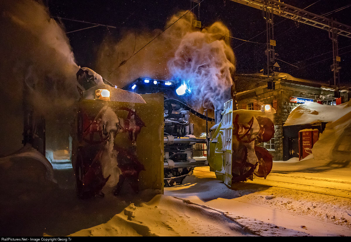 "The beast" or "la Bestia" snow blower Xrot mt # 95404 is clearing track 3 of Ospizio Bernina station at 6 in the morning, the centrifuging units are extended to a width of 6 metres. Shoving is diesellocomotive Gmf 234 # 03 "Albula".