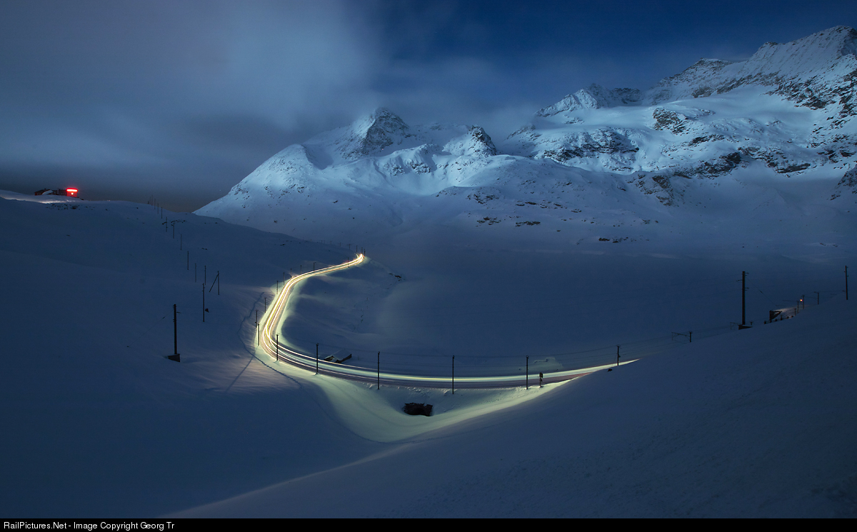 | The full moon lights up the Sassal Mason, Piz Caral and Piz Cambrena (from left) above the frozen and snow-covered Lago Bianco, while the last train of the day from Tirano to St. Moritz, a single ABe 8/12 "Allegra" railcar, snakes its way along the shore. The red light on the left is from the hotel on the Bernina pass road. Exposure time was 70 seconds. |