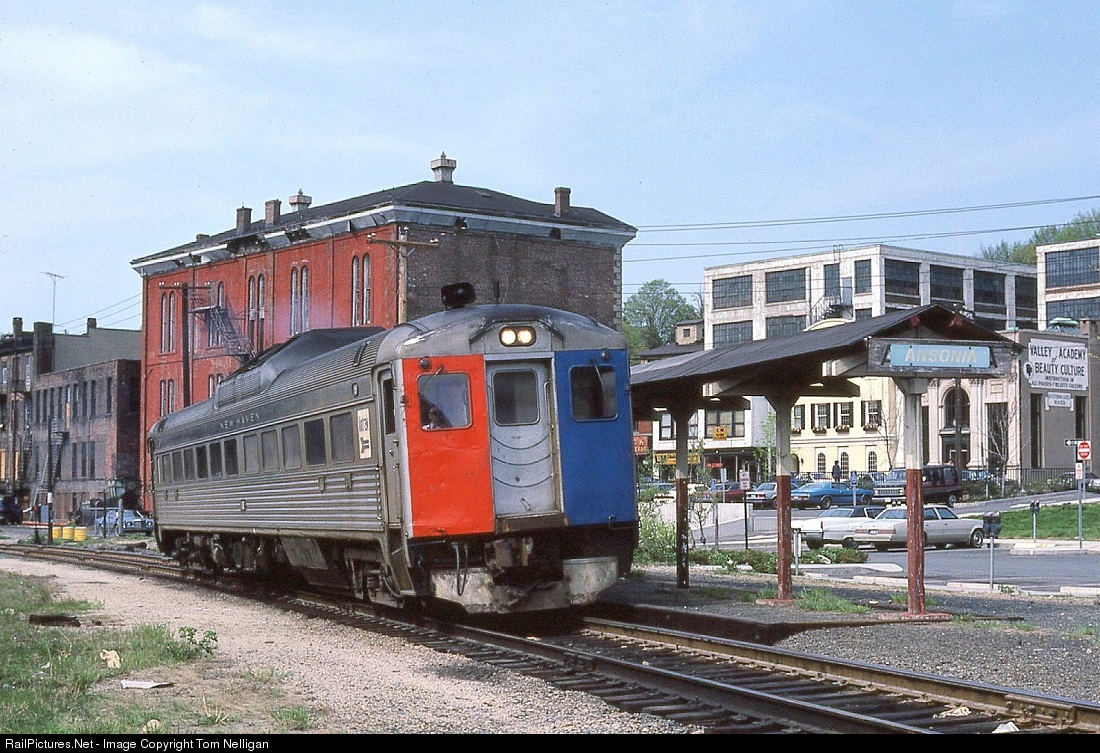 An Amtrak RDC that once belonged to the New Haven RR, now on lease to Metro North, pauses at the modest platform shelter in Ansonia, CT, while covering a Waterbury-Bridgeport branchline run. The large brick building behind the Budd is the former Ansonia Opera House, a once-elegant theater opened in 1870 as a point of cultural pride in what was then a thriving manufacturing town. Closed for decades, it still stands in 2018 and may someday be restored.