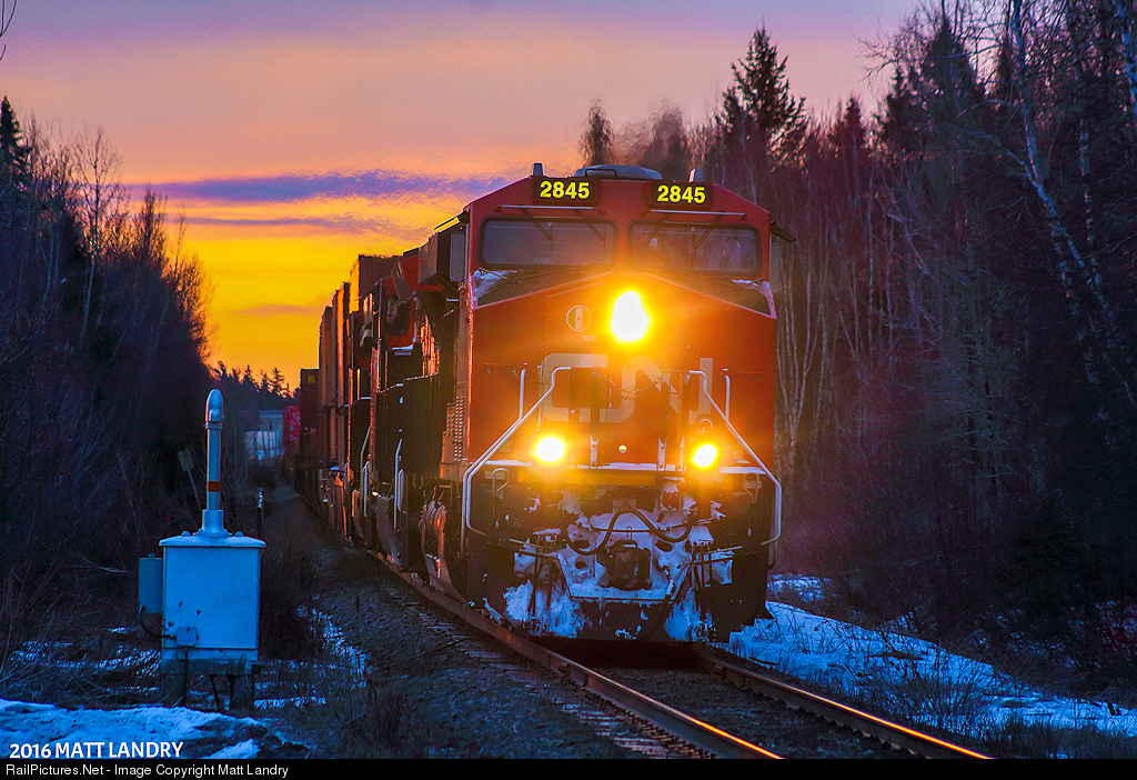 During a colorful sky at sunrise, an AC leads Q121, shortly after departing Moncton, New Brunswick. Next up, the crew change at Edmundston, New Brunswick, about 225 miles away, by rail.