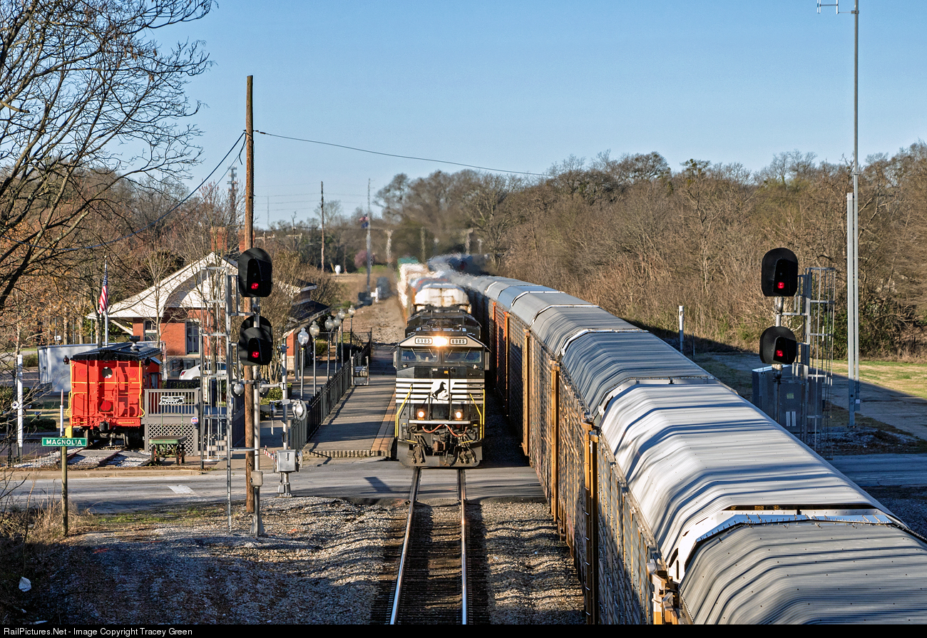 Magnolia Action. As NS 237 sits during a lengthy wait, NS 118 speeds past the historic Spartanburg Depot and across Magnolia Street as it heads north. A beautifully restored Southern Railway caboose sits nearby, located not too distant from the Hayne Shops that constructed the caboose from an old boxcar in the 1940s.